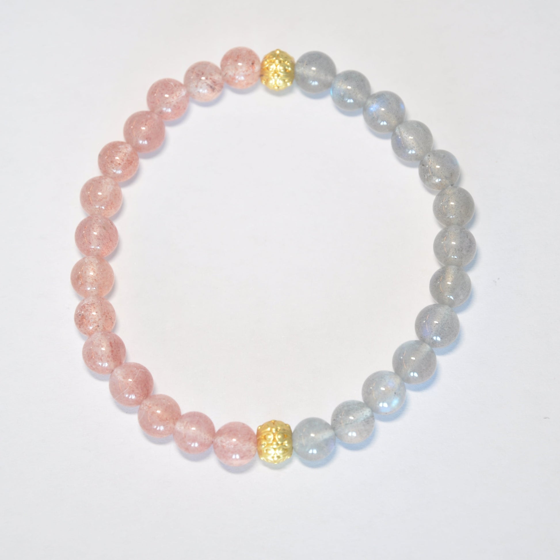 Strawberry Quartz blooms "Peach Blossom Dawn" spring vitality, its rosy iridescence akin to quantum-entangled floral veins intercepting Book of Songs' "blazing brilliance of blossoms", embodying Fire element's generative force. Aligned with Yunlin Stone Manual's doctrine "stone preserves vermilion clouds, governs romantic harmony", it resonates with heart chakra's fervent energy. Gray Moonstone congeals "Moon-Charioteer Wangshu" lunar essence, blue-gray adularescence encoding Huainanzi's celestial cipher "moon traverses nine paths", manifesting Water Virtue's supreme softness. Twin gold beads form Polaris' celestial pivot, both actualizing "Metal generates Water" mutual-generation principle and refracting diurnal-nocturnal spectra through geometric facets, enabling Water-Fire harmonization to generate Wood virtue's spiritual luminescence.
