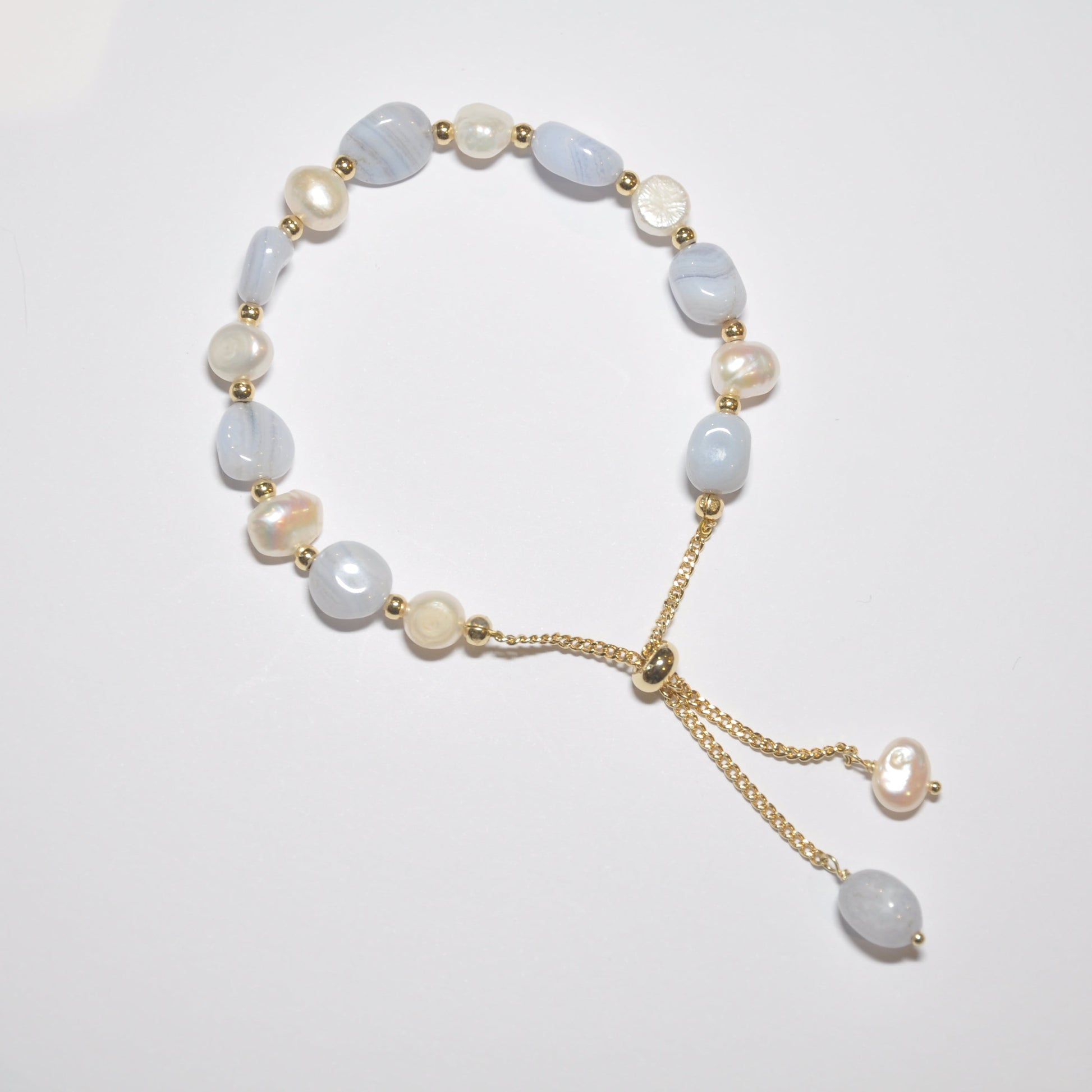 Blue Agate congeals Atlantic water essence, embodying Water Virtue's moistening, covertly resonating with *Book of Changes*' "Heaven's primal water generation" supreme principle; Pearl bears South Sea moon radiance, aligning with Metal element's purity, transforming *Compendium of Materia Medica*'s ancient formula "pearl powder pacifies soul". Gold Bead serves as medium, both manifesting "Earth generates Metal" mutual-generation marvel and refracting dawn-dusk spectral light through geometric faceting. Water nourishes Wood's vitality, Metal constrains Fire's fervor, Earth balances Water's profundity—Three Materials conceal "Water nurtures Wood, Wood kindles Fire, Fire births Earth" latent cyclical sequence, coalescing into Five Phases cosmic cycle at the wrist.