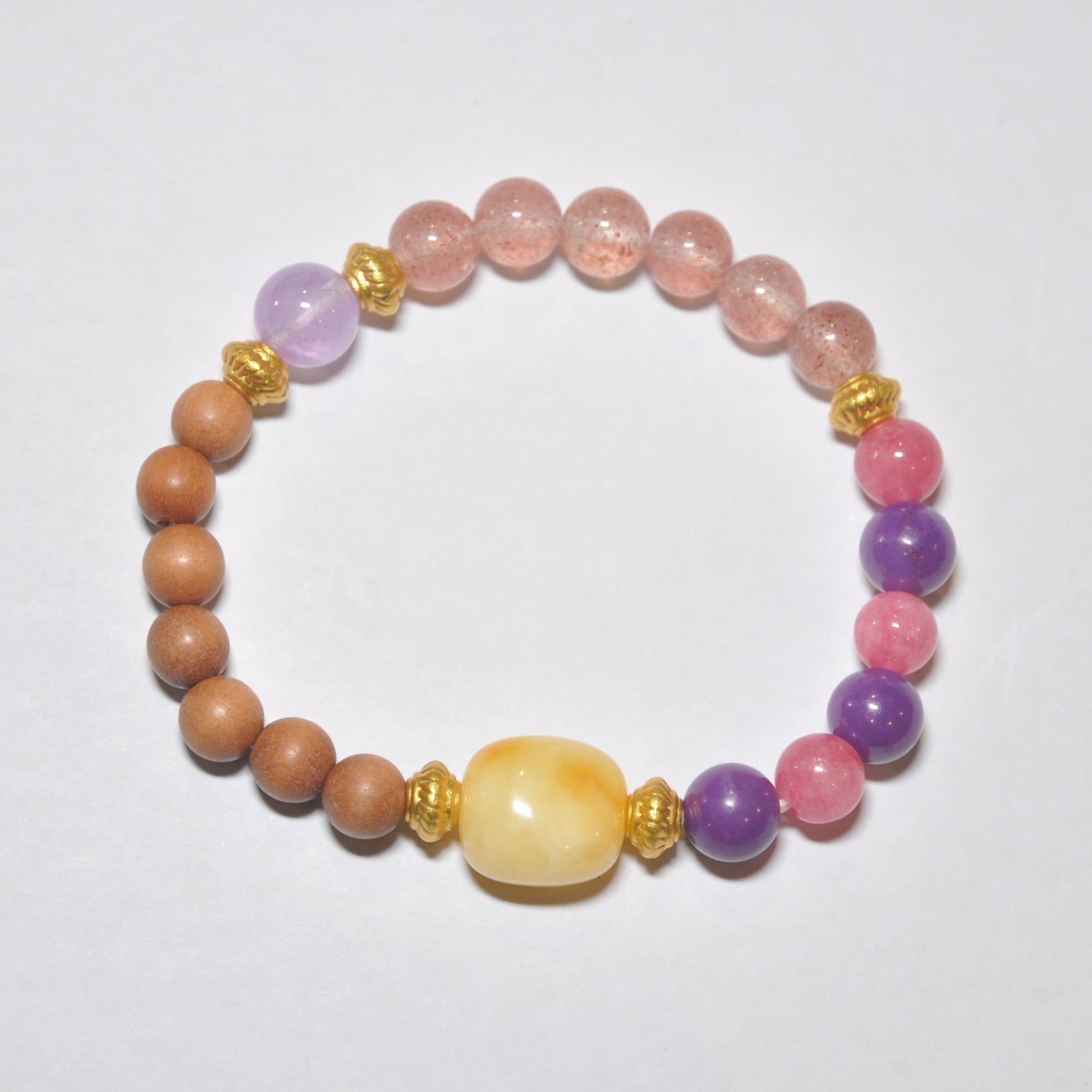 Laos sandalwood: symbolizes vitality and stability, its fragrance can purify the atmosphere and help meditation; the yellow honeycomb pumpkin beads in the middle, which have been time-tested, represent warmth and protection, balancing the energy around the body; purple crystal corresponds to the third eye chakra, inspiring wisdom and spirituality; strawberry crystal can attract love and fortune, and also represents love and tenderness. Overall, this bracelet combines stability, warmth, spirituality, and love, with harmonious energy blending together.