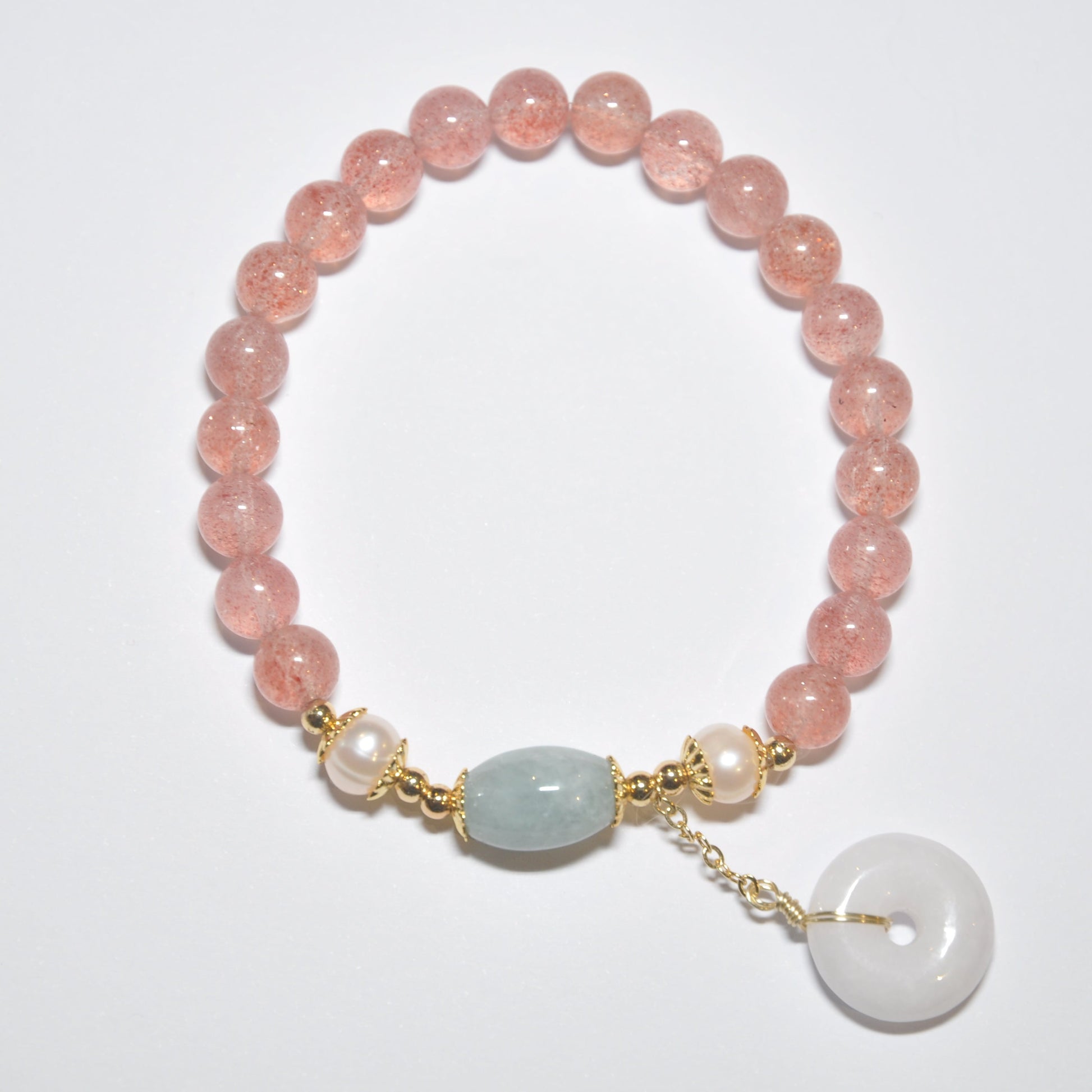 trawberry Quartzet blooms "Tao Yao" splendor, its rosy-lustrous glow akin to intercepting Book of Songs' "blazing floral brilliance" spring essence, embodying Fire element's vitality. Aligned with Yunlin Stone Manual's doctrine "stone harbors vermilion clouds, governing marital harmony", it corresponds to heart chakra's fervent emotions. Pearl congeals "Moon Essence" pure radiance, its cold-layered luminescence covertly resonating with Compendium of Materia Medica's ancient therapeutic formula "pearl stabilizes ethereal souls, arrests panic tremors", embodying Water virtue's gentle moisture. Jadeite inherits "Cang Ling" Wood virtue, its jade-green depths channeling Rites of Zhou's "celadon jade venerates heaven" Eastern spiritual essence. Gold Chain suspends safety-pendant, both manifesting "Metal generates Water" mutual-generation arcana and interlinking "Water nurtures Wood, Wood kindles Fire" through openwork fretwork patterns, coalescing Five Phases cosmic cycle.