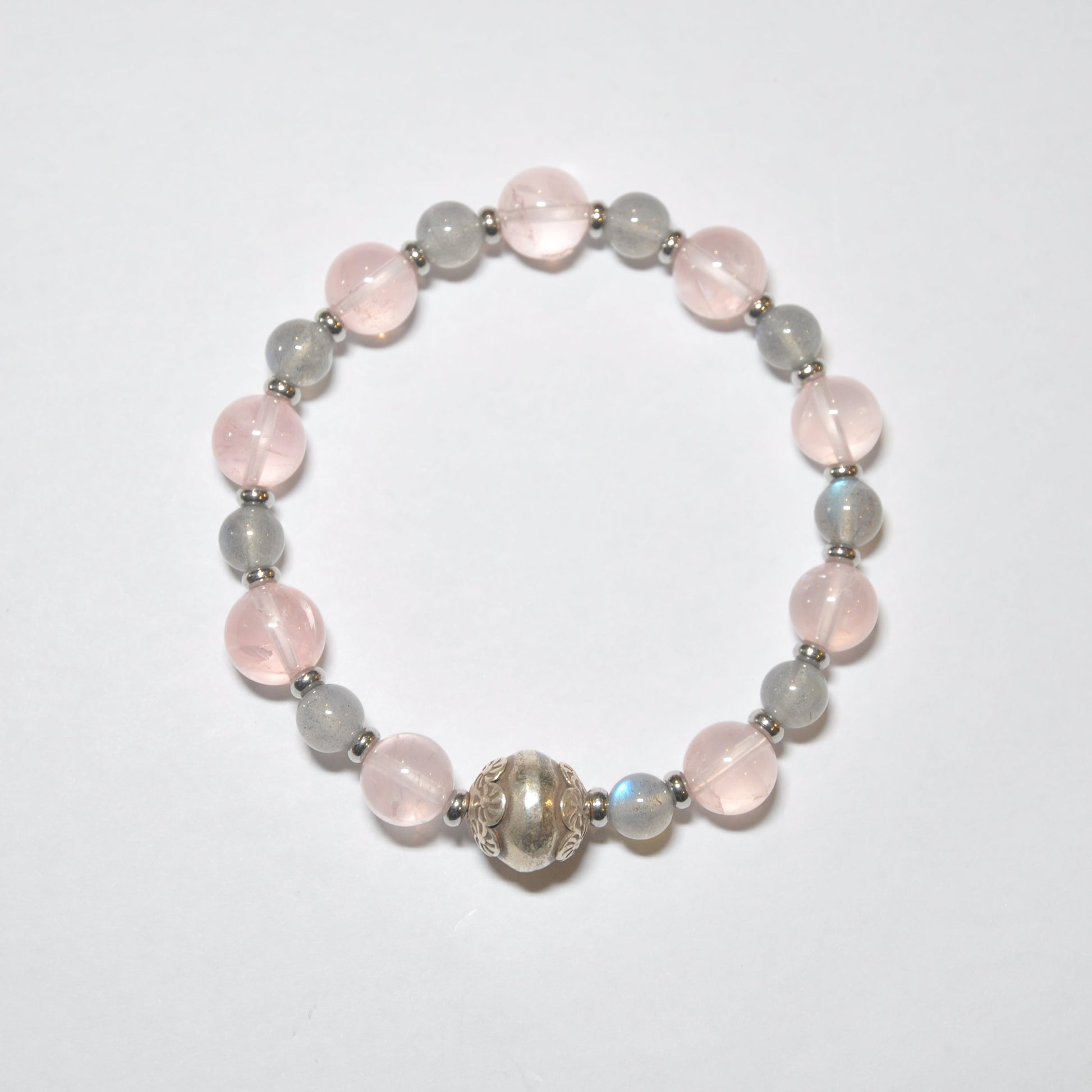 Rose Quartz harbors "Triple-Life Peach Blossom" essence, its soft-pink bead matrix akin to quantum-entangled floral veins intercepting Book of Songs' "blazing brilliance of blossoms", embodying Fire element's generative vitality. Aligned with Yunlin Stone Manual's doctrine "stone preserves crimson mists, governs marital harmony". Gray Moonstone congeals "Wangshu Steering Lunar Chariot" essence, blue-gray iridescence encoding Huainanzi's celestial cipher "moon traverses nine paths", manifesting Water Virtue's ultimate suppleness. Central silver bead engraved with Big Dipper's celestial mechanism bridges diurnal-nocturnal realms through "Metal generates Water" cosmic logic, its prismatic facets refracting spectra to harmonize Water-Fire energies, coalescing into wrist-borne yin-yang equilibrium where peach blossoms blaze upon celestial oceans.