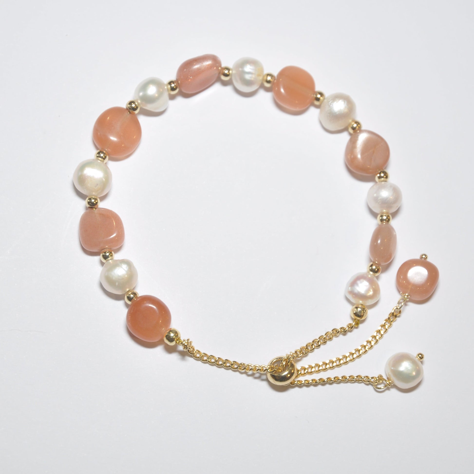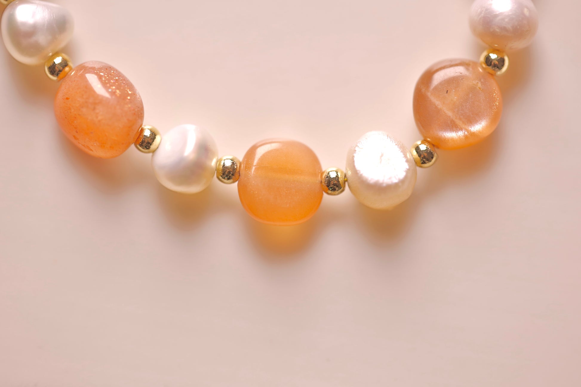 Pink-Orange Sunstone congeals "Xihe Driving Solar Chariot" essence, akin to intercepting Classic of Mountains and Seas' "bathing sun in Sweet Abyss" dawn aurora slice, following Yunlin Stone Manual's ancient wisdom "stone preserves yang harmony, wearing dispels gloom", embodying Fire-Earth mutual generation virtue to dissipate stagnant qi and activate creative energy. Pearl inherits "Mermaid Weeping Moon" spiritual luminosity, its cool-lustrous purity concealing Compendium of Materia Medica's healing cipher: "pearl powder tranquilizes spirit, noctilucence stabilizes soul". Gilded chain resembles Xihe's solar chariot tracks, synchronizing diurnal-nocturnal energies, covertly resonating with "Fire generates Earth, Earth generates Metal, Metal generates Water" Five Phases cosmic cycle.