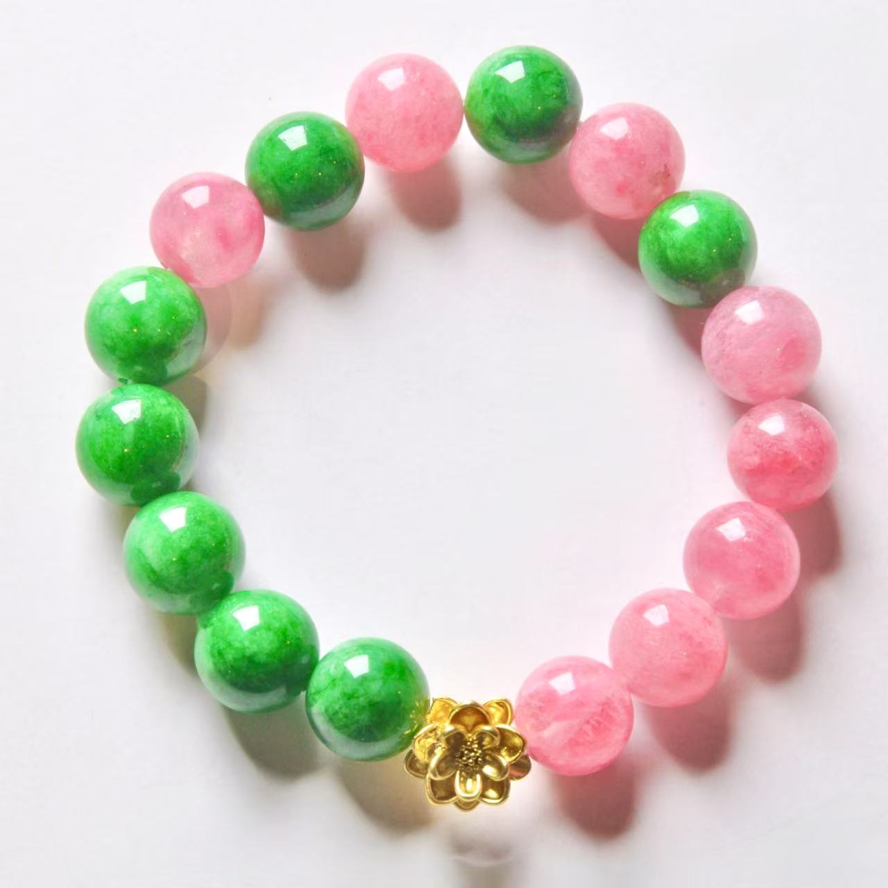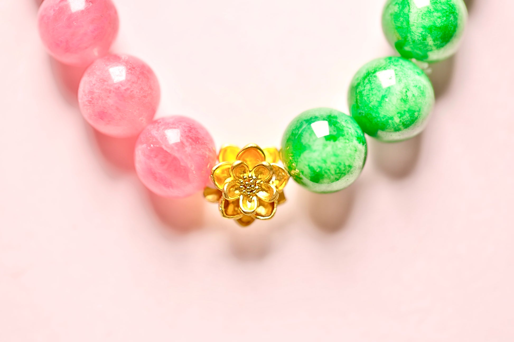 Jadeite congeals "Azure Spirit Wood Virtue", its emerald hues intercepting Classic of Mountains and Seas' "Jade Mountain's yin slope abundant with nephrite, yang slope flourishing with magnolia" vernal mists, embodying Wood element's generative force. Rose Quartz erupts "Peach Blossom Fire Essence", its swirling pink radiance encoding Yunlin Stone Manual's "peach-blossom stone governs matrimonial harmony" through quantum-entangled energy states. Central gilded floral clasp manifests Book of Changes' "Lake Hexagram (Dui)", linking four Luo Shu symbols (Metal-Wood-Water-Fire) in sacred geometry, actualizing Five Phases cycle: "Wood fuels Fire, Fire refines Metal, Metal nourishes Water".