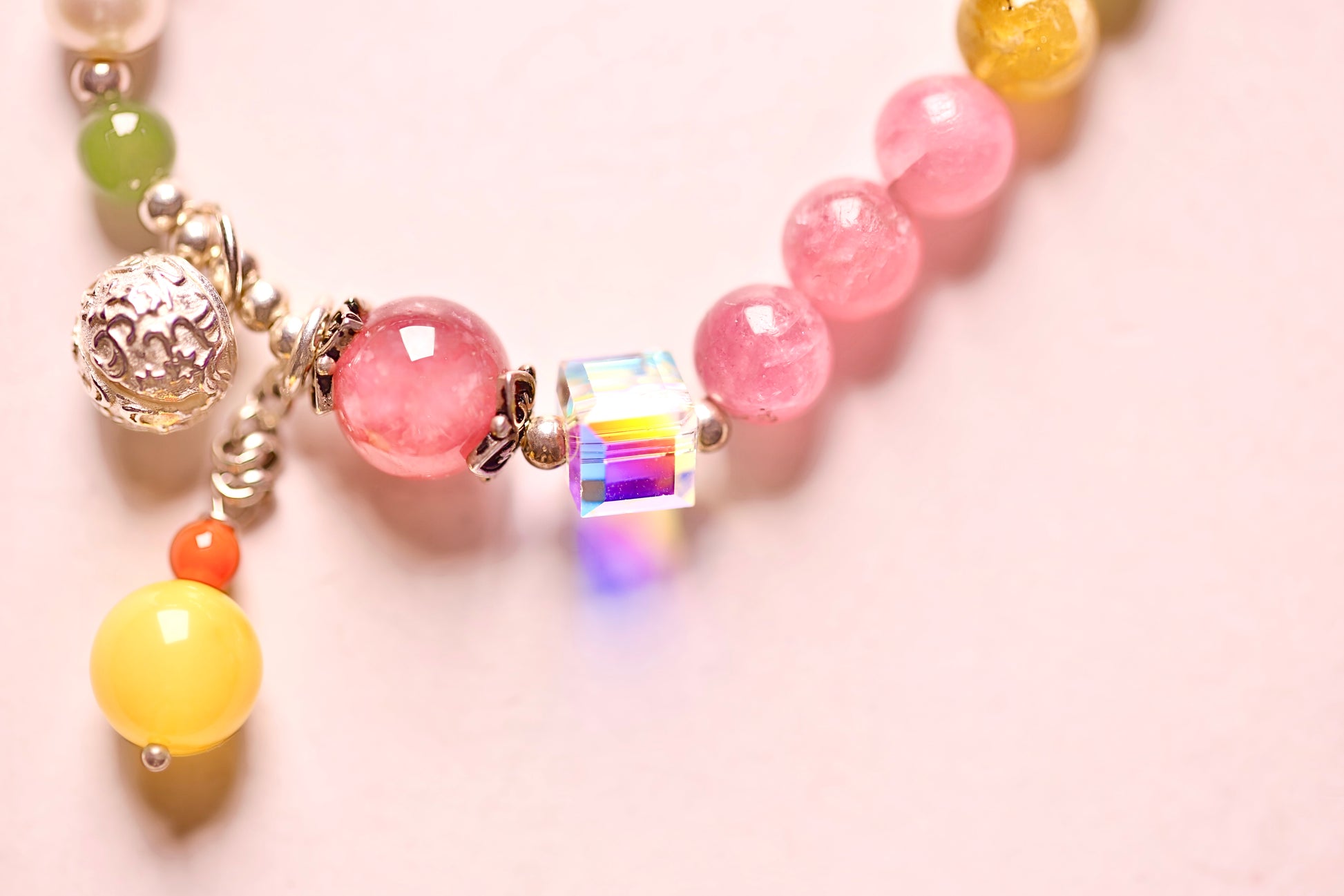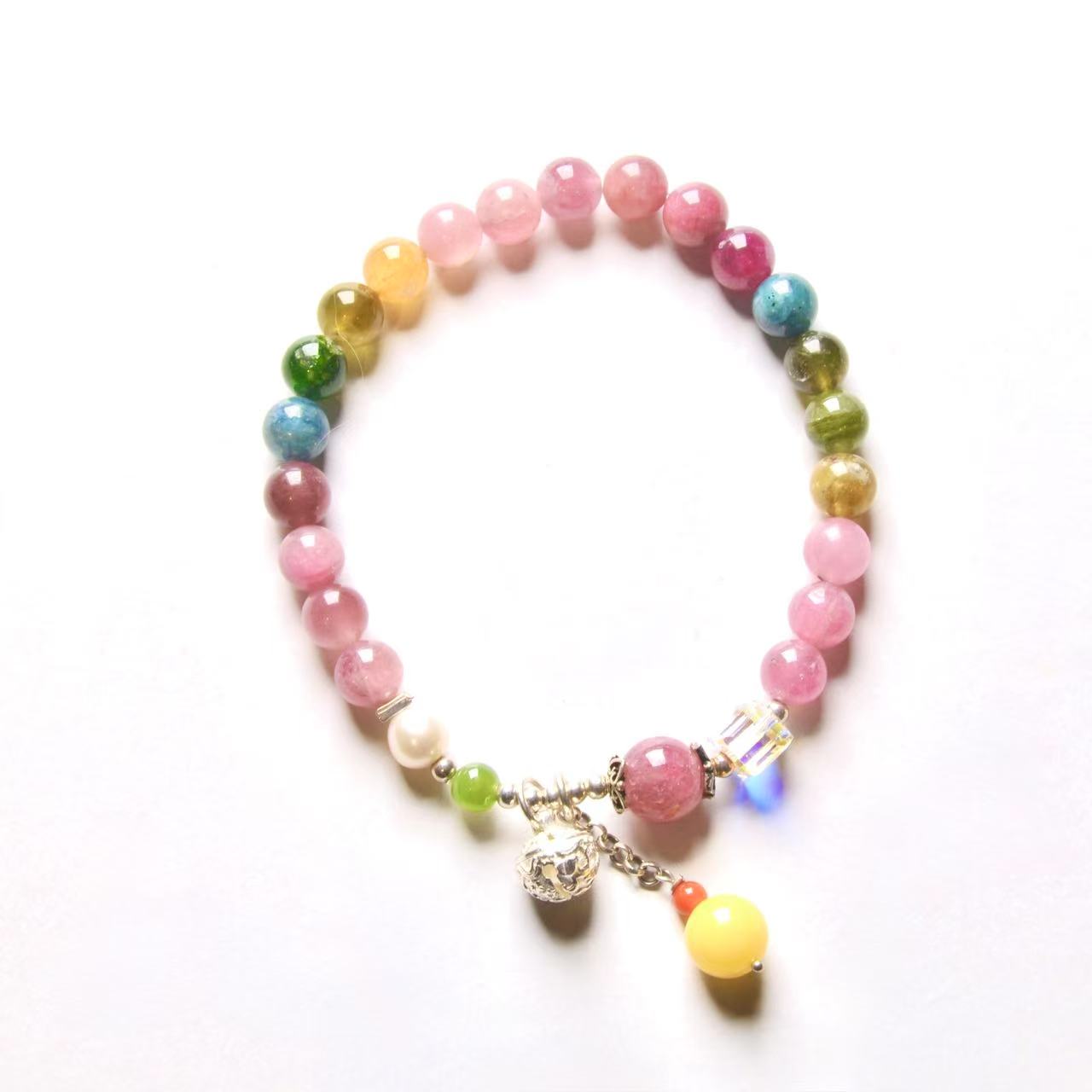 This bracelet is mainly composed of multi-colored tourmaline, each color containing unique energy. Pink tourmaline corresponds to the heart chakra, conveying love and tenderness; green tourmaline is associated with the heart chakra or throat chakra, helping to heal the heart and facilitate smooth communication; pearls symbolize purity and balance emotions; silver accessories conduct energy, and small colored diamonds add high-frequency sparkling power.