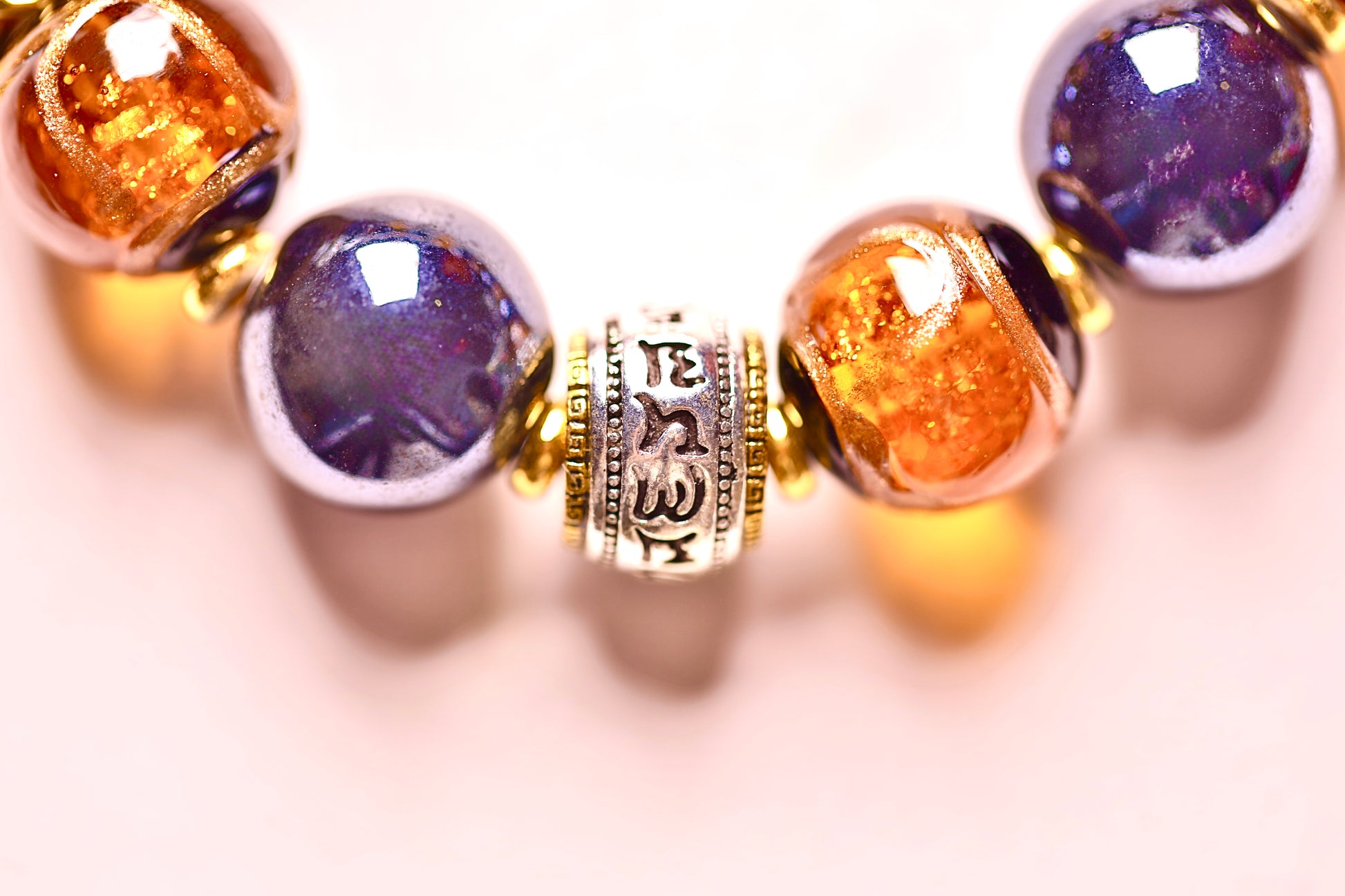 Colored Glass congeals "Sumeru Incense Fire" Fire element, its smoky veils preservingŚūraṅgama Sūtra's "disciplined samadhi-incense fumigating decosmic realms" as quantum-entangled prayer vectors; Glass matrix absorbs "Cosmic Dust Kalpas" Earth virtue, its nebular inclusions encoding Dunhuang Mogao Grottoes' century-accumulated incense ash temporal-spatial memory. Gilded circlet traces Polaris astral tracks bridging cosmic planes, manifesting Book of Changes' arcana "Fire generates Earth, Earth hoards Metal", enabling devotional fumigation's spirituality to resonate with stellar dust within wrist's microcosm.