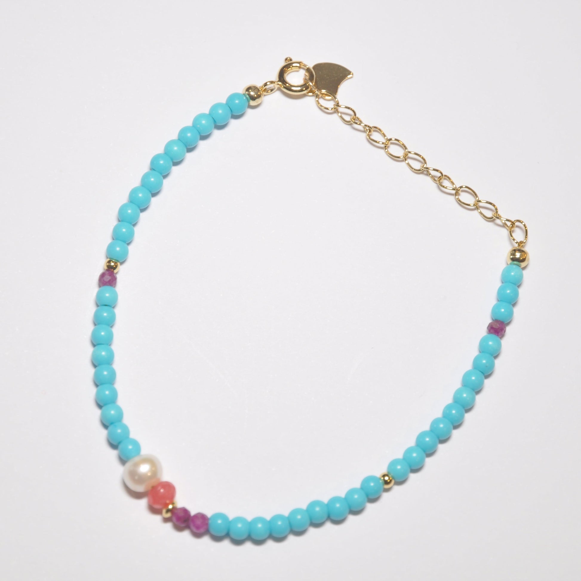 The main body is turquoise millet beads, the color is fresh like spring lake water, in the five elements system of traditional culture, corresponding to water virtue. Turquoise is a phosphate mineral, which has a certain energy conductivity. It absorbs and stores energy. It means to protect and ward off evil spirits. The pearls dotted in the meantime are warm and round, exuding a soft and elegant aura, which is in harmony with water morality; Amethyst presents a mysterious glow, and the elements are cleverly matched to build a unique energy circulation system.