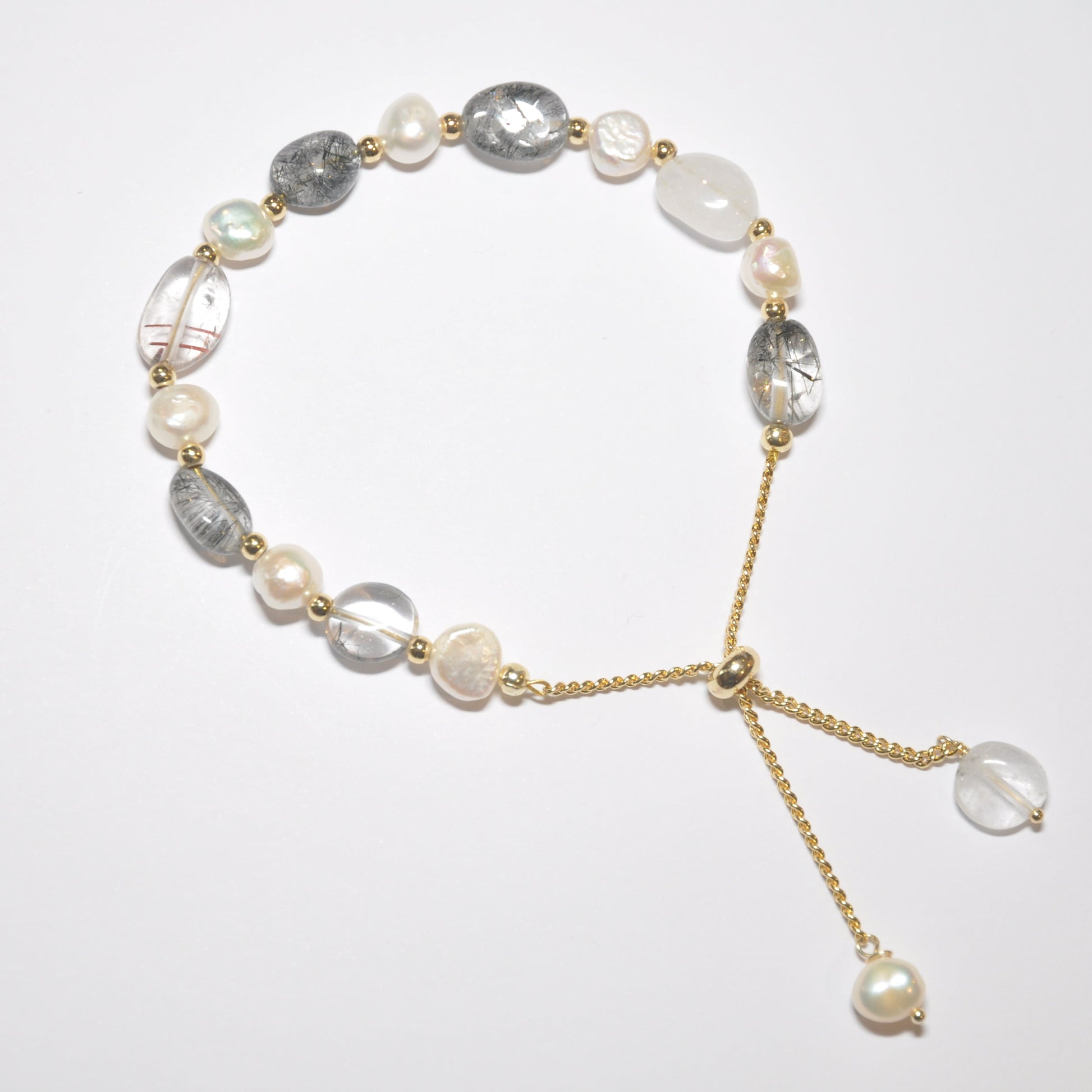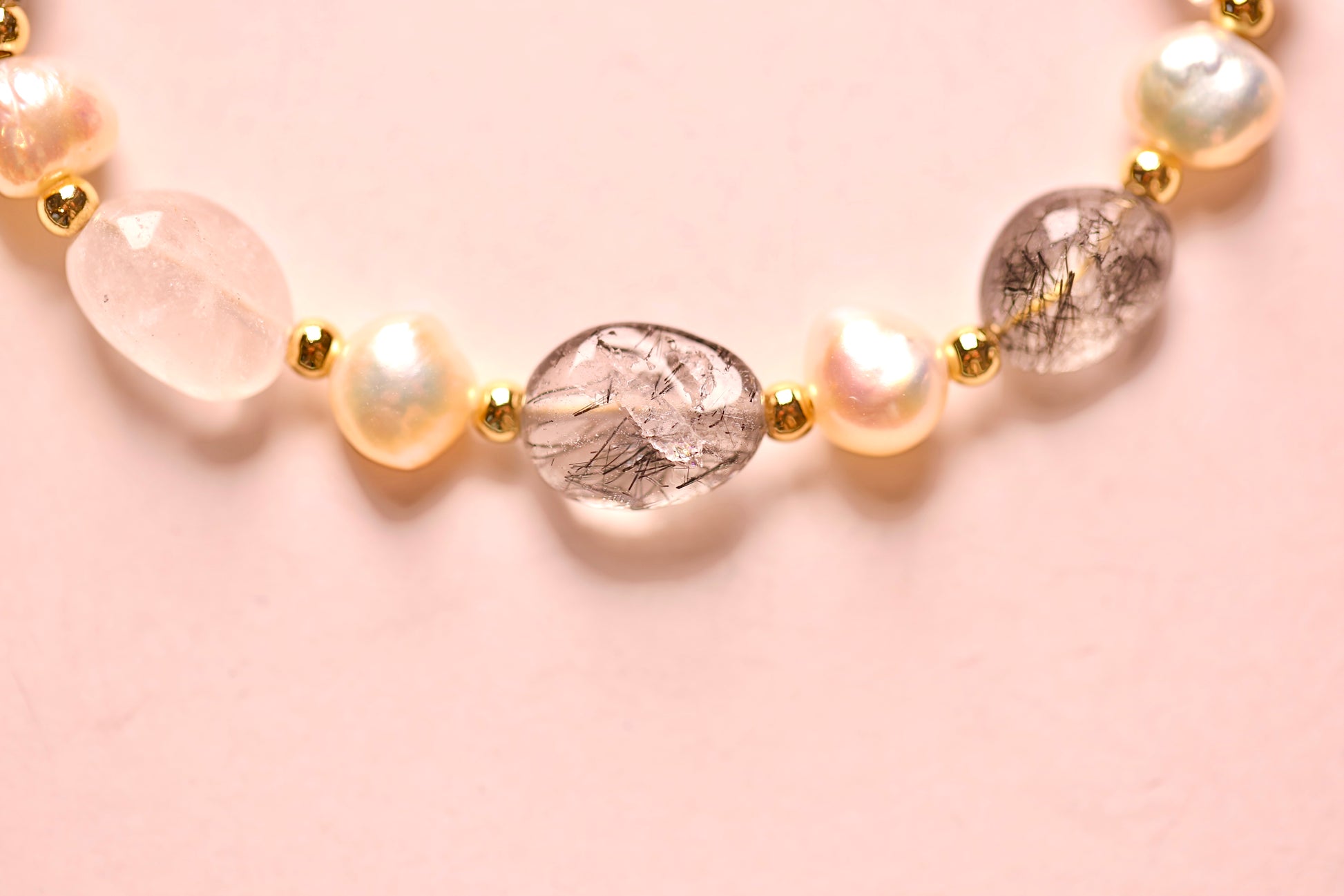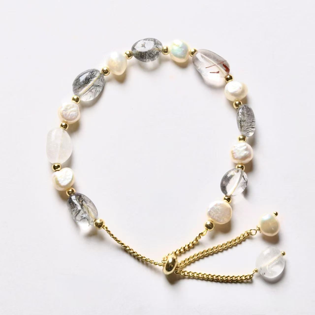 Pearl congeals "Ocean-Moon Essence" Water Virtue, its frosted lamination concealing Yingya Shenglan's tidal cipher "noctilucent pearl calms raging waves", embedding lunar gravitational harmonics. Rutilated Quartz erupts "Solar Charioteer Xihe" Metal essence, gray-black filaments intercepting NASA Solar Dynamics Observatory-captured coronal hole particle streams, their golden trajectories resonating with Yunlin Stone Manual's ancient axiom "stone reveals golden veins, governs delusion-piercing clarity". Gilded bead-chain constructs zodiacal star orbits, both manifesting "Metal generates Water" mutual-generation arcana and refracting spectral light to choreograph quantum-entangled spacetime warps.